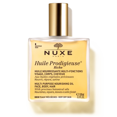 Kosmetyk w nietypowej postaci, przeznaczony do wszechstronnej pielęgnacji twarzy i ciała, a także włosów. Suchy olejek Huile Prodigieuse Riche to specjalnie opracowana mieszanka 7 roślinnych olejków o dobroczynnym wpływie na kondycję skóry. Głęboko odżywia, dodając jej komórkom energii do prawidłowego funkcjonowania. Pomaga utrzymać właściwy stopień nawilżenia, dzięki czemu zachowuje jędrność i elastyczność. Zapewnia ochronę przed wolnymi rodnikami tlenowymi, przedwcześnie indukującymi procesy starzenia się. Ogranicza niekorzystny wpływ zanieczyszczeń obecnych w otaczającym środowisku. Powleka włókna włosowe, zmniejszając ich tendencję do puszenia się i rozdwajania końcówek. Dodaje blasku i energii.