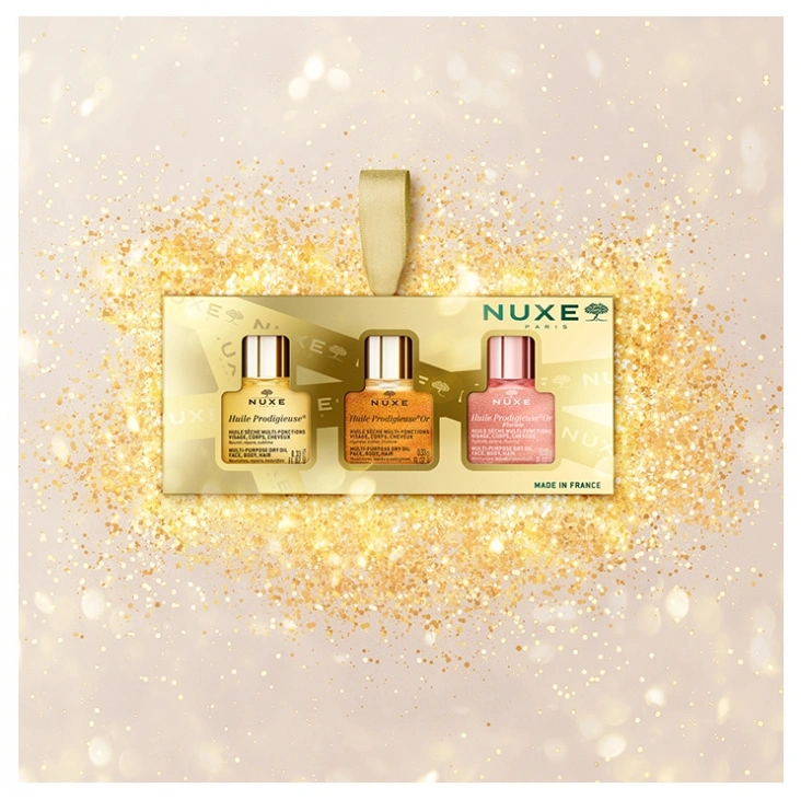 • Zestaw Nuxe Mini Suchych Olejków – trzy wersje kultowego Huile Prodigieuse®: klasyczna, złota i kwiatowa. Odżywiają, rozświetlają i pielęgnują skórę oraz włosy.