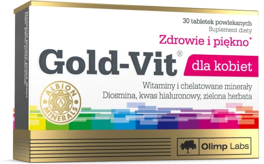 Odpowiednio zbilansowana dieta to podstawa dobrego samopoczucia, jednak w codziennym pośpiechu nie zawsze łatwo jest dostarczyć wszystkich niezbędnych mikroskładników. Olimp Gold-Vit® dla kobiet to suplement diety stworzony z myślą o kobietach, które chcą w wygodny sposób uzupełnić dietę w witaminy i składniki mineralne. Formuła oparta jest w dużej mierze na wysoko przyswajalnych chelatach aminokwasowych Albion™, cenionych za dobrą tolerancję i biodostępność.