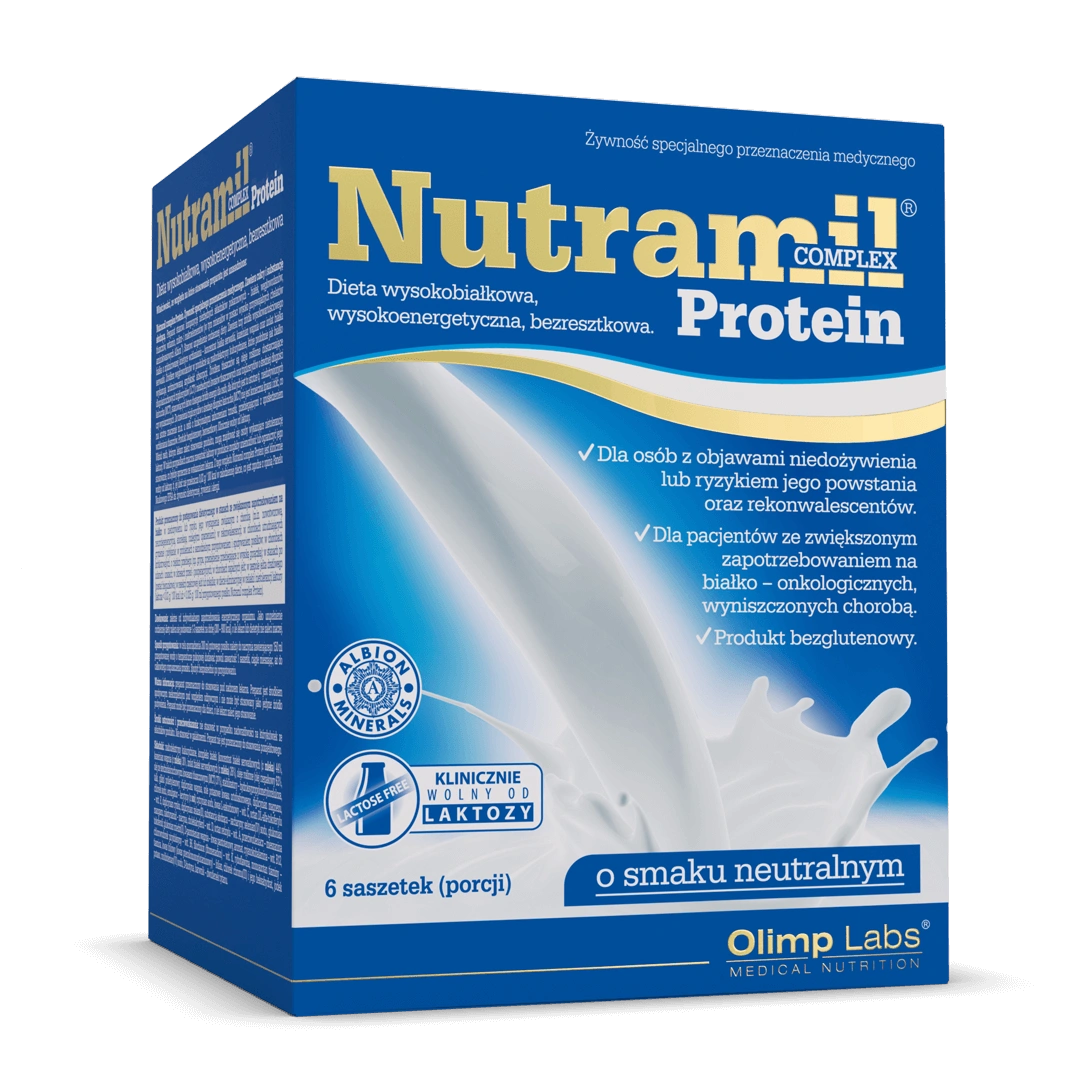 - Nutramil complex Protein to żywność specjalnego przeznaczenia medycznegom zawierająca kompozycję niezbędnych składników pokarmowych, uzupełniającą codzienną dietę osób chorych i rekonwalescentów.