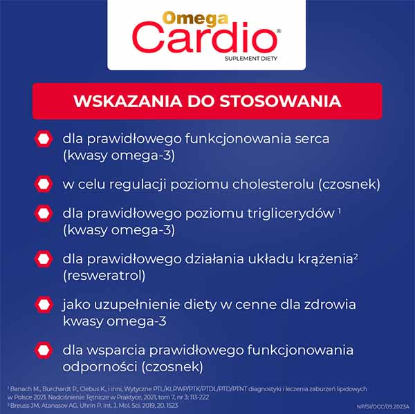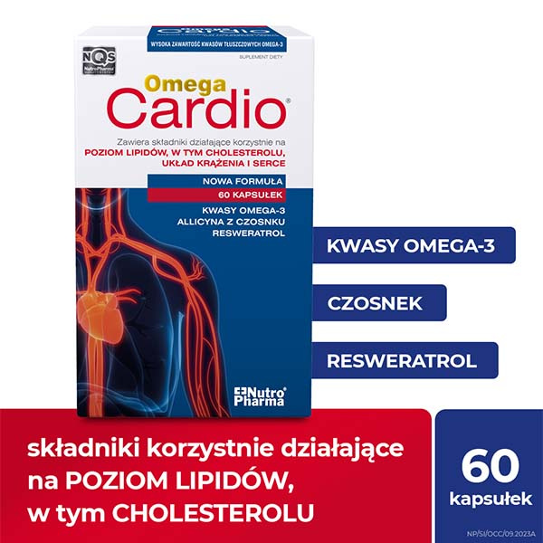 • Omega Cardio to suplement diety na serce i układ krążenia, którego składniki pomagają utrzymać prawidłowy poziom cholesterolu i trójglicerydów.