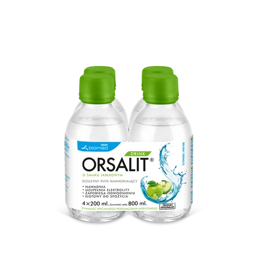 ORSALIT® DRINK to żywność specjalnego przeznaczenia medycznego do postępowania dietetycznego w stanach odwodnienia organizmu, szczególnie podczas biegunki lub wymiotów oraz w sytuacjach, w których występuje ryzyko odwodnienia. Preparat przeznaczony jest dla dzieci powyżej 3. roku życia. Powinien być przyjmowany pod nadzorem lekarza. Produkt bezglutenowy, nie zawiera białek mleka i laktozy.