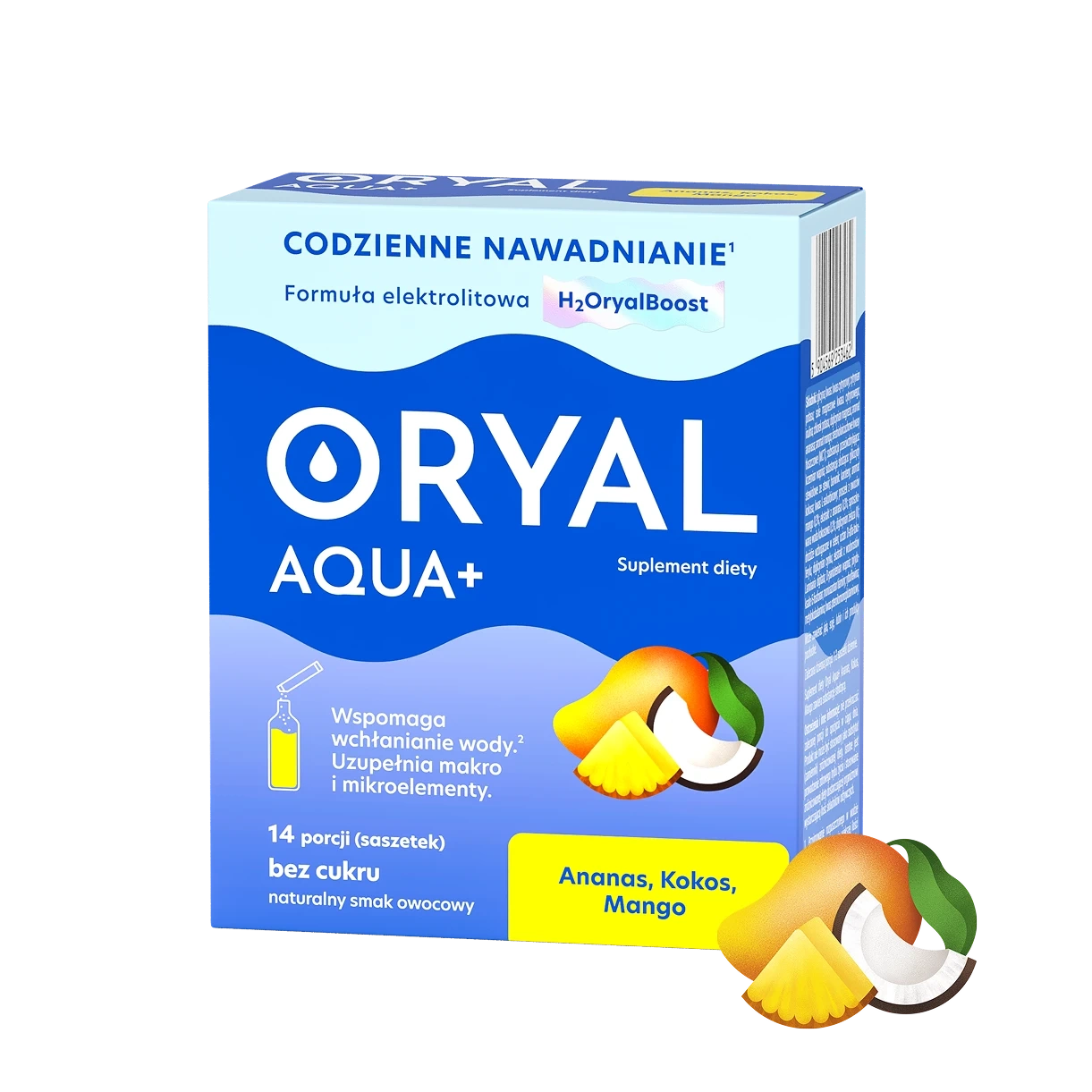 ORYAL AQUA+ o smaku ananasa, kokosa i mango to suplement diety w formie proszku do rozpuszczania w wodzie, który łączy elektrolity, witaminy i prebiotyk inulinę w unikalnej formule H2OryalBoost. Doskonały wybór dla osób aktywnych, pracujących umysłowo, a także tych, którzy chcą wspierać codzienne nawodnienie organizmu z przyjemnością i skutecznością.