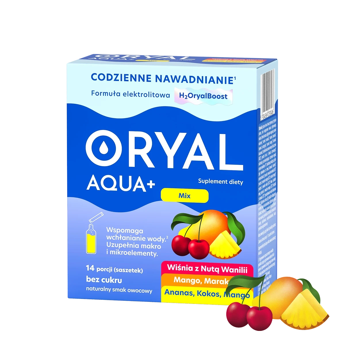 ORYAL AQUA+ MIX to suplement diety w wygodnych saszetkach, łączący elektrolity, witaminy i prebiotyk inulinę w innowacyjnej formule H2OryalBoost. Wersja MIX zawiera trzy starannie dobrane kompozycje smakowe, które sprawią, że codzienne nawadnianie stanie się zdrowym rytuałem i przyjemnością.