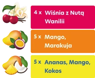 • 3 smaki w jednym opakowaniu – wiśnia z nutą wanilii, ananas z kokosem, mango z marakują – codzienna różnorodność bez nudy.