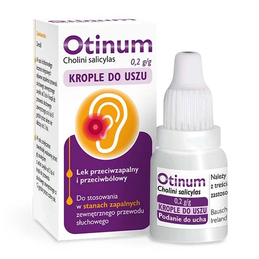 Otinum to lek w postaci kropli do uszu, przeznaczony do stosowania miejscowego u osób dorosłych. Jest polecany doraźnie w stanach zapalnych zewnętrznego przewodu słuchowego, które objawiają się bólem, świądem oraz zaczerwienieniem. Dzięki zawartości salicylanu choliny – pochodnej kwasu salicylowego – krople wykazują działanie przeciwbólowe i przeciwzapalne, pomagając szybciej złagodzić nieprzyjemne dolegliwości. Dodatkowo glicerol zawarty w preparacie zmiękcza woskowinę, dlatego Otinum bywa stosowane także przed płukaniem ucha w celu ułatwienia usunięcia zalegającej, stwardniałej woskowiny. Po podaniu do ucha lek działa miejscowo i nie wywiera działania ogólnoustrojowego.