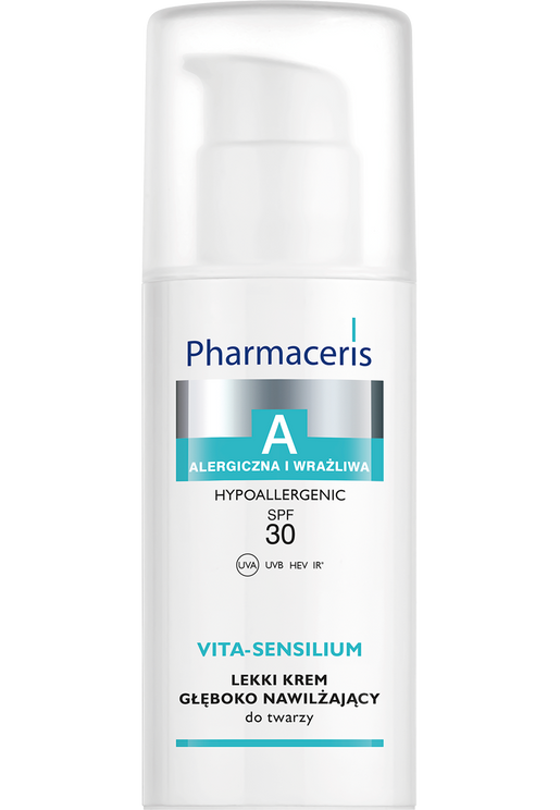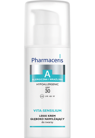 Pharmaceris A Vita-Sensilium Lekki krem głęboko nawilżający SPF 30 to hipoalergiczny dermokosmetyk stworzony z myślą o codziennej pielęgnacji skóry wrażliwej, skłonnej do podrażnień, odwodnienia i przesuszenia. Idealny do twarzy i okolic oczu, również dla osób z tendencją do alergii czy nadreaktywności skóry. Krem natychmiast przywraca nawilżenie, zapewniając uczucie ukojenia i miękkości aż do 15 godzin po aplikacji.