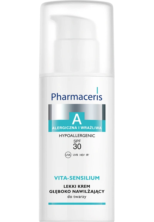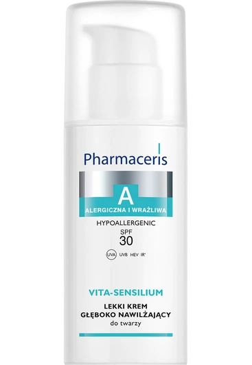 Pharmaceris A Vita-Sensilium Lekki krem głęboko nawilżający SPF 30 to hipoalergiczny dermokosmetyk stworzony z myślą o codziennej pielęgnacji skóry wrażliwej, skłonnej do podrażnień, odwodnienia i przesuszenia. Idealny do twarzy i okolic oczu, również dla osób z tendencją do alergii czy nadreaktywności skóry. Krem natychmiast przywraca nawilżenie, zapewniając uczucie ukojenia i miękkości aż do 15 godzin po aplikacji.