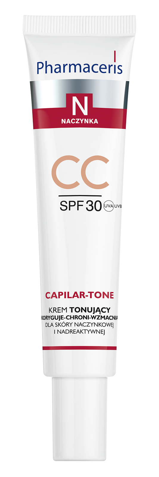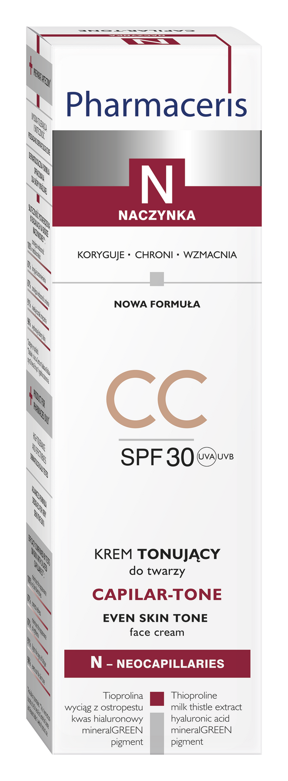 Receptura w formie lekkiego, tonującego CC-kremu, wzbogacona o zielony pigment mineralny, znany z właściwości skutecznie korygujących zaczerwienienia oraz niwelowania widocznych naczynek, efektywnie wyrównuje koloryt skóry. Krem oparty na fotostabilnych filtrach UVA i UVB, zapewnia wysoką ochronę przeciwsłoneczną, chroniąc skórę przed nadreaktywnością na czynniki zewnętrzne. Opatentowana formuła tioproliny z wyciągiem z ostropestu działa antyoksydacyjnie, efektywnie neutralizując wolne rodniki.Redukuje syntezę mediatorów podrażnień, wzmacniając naczynka oraz skutecznie zapobiegając powstawaniu zaczerwienień i rumienia, a także zmniejszając ich widoczność.Wysokocząsteczkowy kwas hialuronowy, wygładza skórę, poprawiając jej jędrność i elastyczność oraz nawilża i regeneruje skórę. Formuła dostosowuje się do odcienia skóry, równomiernie ją pokrywając, bez efektu maski.