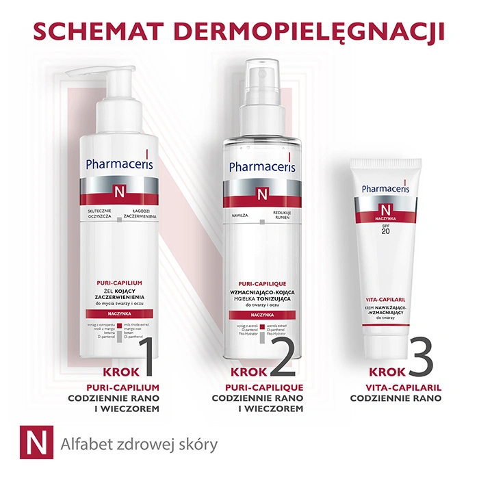 Pharmaceris N Vita-Capilaril to lekki, intensywnie nawilżający i wzmacniający krem opracowany specjalnie dla cery naczynkowej, suchej i wrażliwej, ze skłonnością do podrażnień, rumienia i utraty wilgoci. Dzięki synergicznemu działaniu witaminy PP (niacynamidu), złotej algi, wosku z oliwek i kompleksu antyoksydacyjnego z tiotainą i tioproliną krem przywraca skórze zdrowy wygląd, nawilżenie i elastyczność, jednocześnie redukując zaczerwienienia i wzmacniając naczynka.