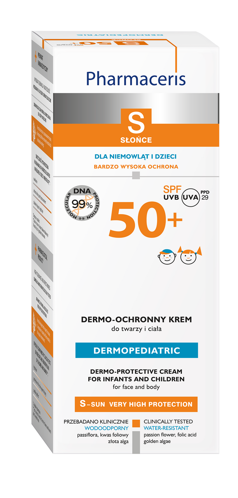PHARMACERIS S krem dla dzieci to specjalistyczny krem opracowany z myślą o skutecznej ochronie wrażliwej skóry niemowląt i dzieci narażonej na negatywne działanie słońca i czynników zewnętrznych. Bardzo wysoka ochrona przed intensywnym nasłonecznieniem, oparzeniami słonecznymi i promieniowaniem UVA i UVB delikatnej i wrażliwej skóry twarzy i ciała dzieci i niemowląt powyżej 6 miesiąca. W preparacie zastosowano specjalny system fotostabilnych filtrów UVA i UVB, o podwójnym mechanizmie anty-UV (odbijania i pochłaniania promieni słonecznych) dla zapewnienia bardzo wysokiej ochrony przed intensywnym nasłonecznieniem i jego niekorzystnymi skutkami. Formuła kremu wzbogacona olejem z passiflory łagodzi podrażnienia oraz niweluje negatywny wpływ czynników zewnętrznych. Uzupełnieniem receptury kremu jest kwas foliowy, który dodatkowo chroni komórki skóry przed uszkodzeniami wywołanymi promieniowaniem UV. Olejowy ekstrakt ze „złotej” algi zapewnia odpowiednie nawilżenie skóry, zapobiegając przesuszeniom i nadmiernej utracie wody z naskórka. Formuła wodoodporna i szybko wchłaniająca. Nie pozostawia tłustej i lepkiej warstwy.