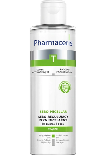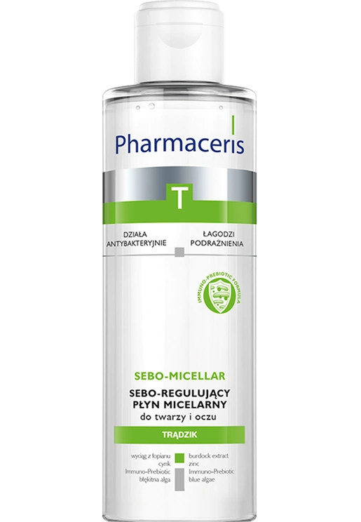 Pharmaceris T Sebo-Micellar to specjalistyczny płyn micelarny stworzony z myślą o skórze trądzikowej, tłustej i mieszanej, wymagającej skutecznego oczyszczenia bez ryzyka podrażnień. Innowacyjna formuła z wyciągiem z łopianu, cynkiem PCA i biotyną usuwa zanieczyszczenia, makijaż oraz nadmiar sebum, jednocześnie łagodząc i odświeżając skórę. Płyn reguluje florę bakteryjną naskórka, redukuje niedoskonałości oraz ogranicza rozwój bakterii odpowiedzialnych za trądzik, nie powodując przesuszenia.