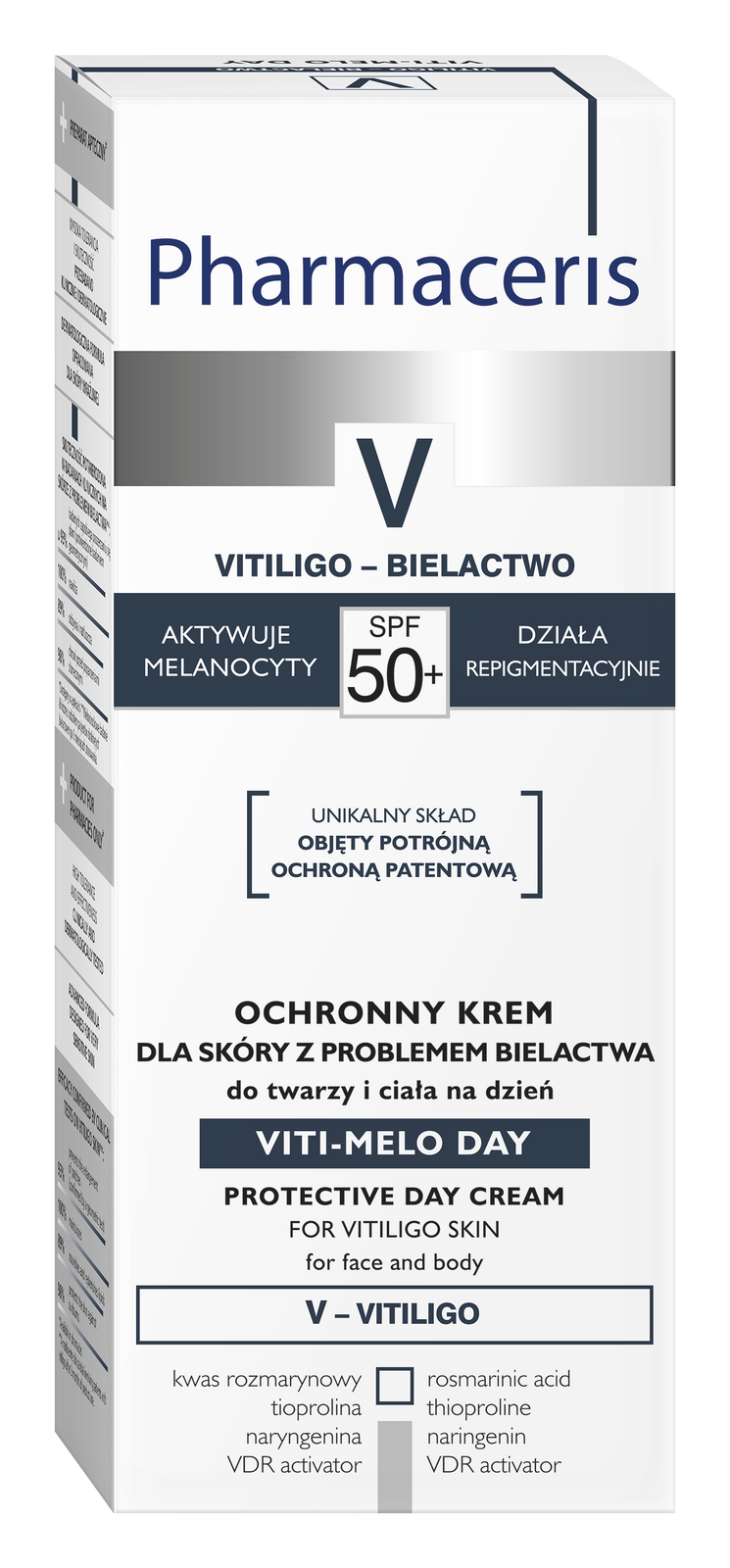 Ochronny krem dla skóry z problemem bielactwa, SPF 50+. Krem polecany dla dorosłych i dzieci (od 5 roku życia) do ochrony i pielęgnacji na dzień, dla skóry z problemem bielactwa i zmianami depigmentacyjnymi.