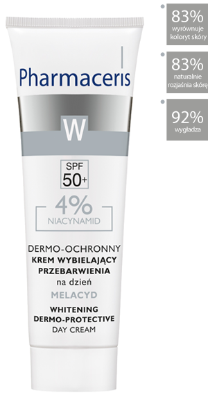 WSKAZANIA: Krem polecany do codziennej pielęgnacji na dzień, dla skóry z przebarwieniami, nierównym kolorytem oraz narażonej na powstawanie przebarwień podczas ekspozycji na słońce, zmian hormonalnych, przyjmowania środków antykoncepcyjnych, w okresie ciąży, po zabiegach dermatologicznych i medycyny estetycznej oraz zmianach zapalnych. DZIAŁANIE: Unikalny wysokoskoncentrowany krem zawiera 4% Niacynamidu, którego efekt działania porównywalny jest do hydrochinonu*, stosowanego w wybielających terapiach medycznych. Niacynamid o wysokim współczynniku bezpieczeństwa, skutecznie hamuje zarówno syntezę melaniny, jak i migrację barwnika do naskórka, przeciwdziałając powstawaniu nowych zmian barwnikowych. Efekt kilkupoziomowego wybielania potęguje wit. C oraz kompleks Biomimetic-Peptid. Stopniowo zmniejszają one intensywność istniejących przebarwień, rozjaśniają i wyrównują koloryt skóry. Witamina E pełni rolę fizjologicznego antyoksydantu, opóźniając procesy starzenia. SPF 50+ zapewnia skuteczną fotoochronę skóry. Krem nie powoduje odbarwień zdrowej skóry. HIPOALERGICZNY WYSOKA TOLERANCJA I SKUTECZNOŚĆ PRZEBADANO DERMATOLOGICZNIE Pojemność: 30ml Przebarwione obszary skóry smarować 2-4 razy dziennie. Efekt wybielający widoczny po min. 3 tygodniach stosowania. W trakcie kuracji i 10 tygodni po jej zakończeniu unikać ekspozycji skóry na słońce. Zalecane jest jednoczesne stosowanie kremu na noc z serii Pharmaceris W. SKŁADNIKI AKTYWNE: Niacynamid 4% - skutecznie hamuje zarówno syntezę melaniny, jak i migrację barwnika do naskórka, przeciwdziałając powstaniu nowych zmian barwnikowych. Zapobiega szkodom wywołanym przez promieniowanie UV i przyspiesza proces regeneracji skóry uszkodzonej działaniem promieni UV. Witamina C - hamuje aktywność tyrozynazy (enzymu aktywującego powstawanie przebarwień). Wykazuje działanie rozjaśniające powierzchnię skóry. Redukuje szkodliwy wpływ promieniowania UV, pomagając chronić DNA komórek skóry. Chroni lipidy przed utlenieniem i hamuje procesy starzenia się skóry. Witamina E - tzw. witamina młodości o silnym działaniu przeciwutleniającym, chroni przed wolnymi rodnikami i niekorzystnymi czynnikami zewnętrznymi. Redukuje zmarszczki oraz nawilża i przyspiesza proces regeneracji i odbudowy skóry. Biomimetic-Peptid - biomimetyczny peptyd zmniejsza ilość nierównomiernie rozmieszczonej w powierzchniowych warstwach skóry melaniny, stopniowo zmniejszając intensywność przebarwień i równomiernie rozjaśniając naskórek.