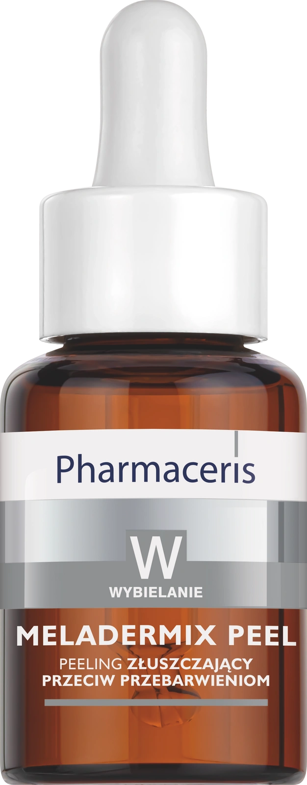 Zawiera 3 20% kwasy: mlekowy, glikolowy i migdałowy. Receptura peelingu działa kilkupoziomowo. Złuszcza, zmniejsza szorstkość i widoczność już istniejących zmian oraz zapobiega pojawianiu się nowych. Redukuje poziom melaniny w skórze, co powoduje rozjaśnienie przebarwień i wyrównanie kolorytu skóry. Pharmaceris W, Meladermix Peel, Peeling złuszczający przeciw przebarwieniom, wzmacnia barierę ochronną skóry, zmniejsza widoczność śladów pozapalnych, blizn oraz porów. Sprawia, że skóra jest ujędrniona i gładka a koloryt skóry wyrównany.