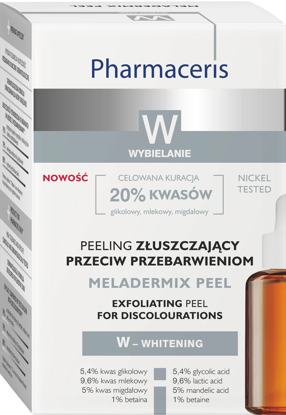 Pharmaceris W, Meladermix Peel, Peeling złuszczający przeciw przebarwieniom, skład: 230822 Składniki/Ingredients: Aqua (Water), Propylene Glycol, Lactic Acid, Glycolic Acid, Mandelic Acid, Sodium Hydroxide, Betaine, Xanthan Gum