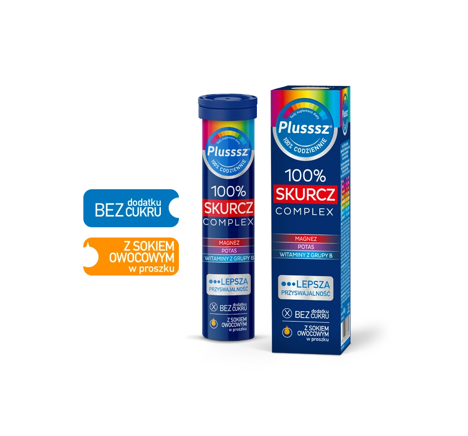 Plusssz 100% Skurcz Complex to specjalistyczny preparat zawierający niezbędny dla organizmu magnez oraz potas, które pomagają w prawidłowym funkcjonowaniu mięśni. Ponadto zawiera 5 najważniejszych witamin z grupy B w ilościach zapewniających 100% dziennych Referencyjnych Wartości Spożycia dla osób dorosłych w 1 tabletce.