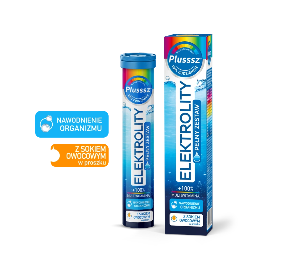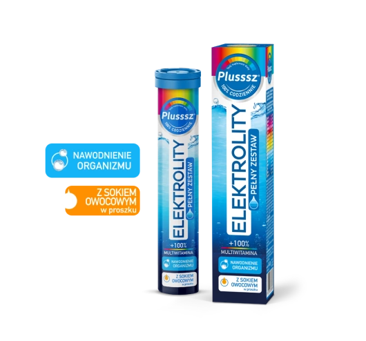 Plusssz Elektrolity + 100% Multiwitamina zawiera specjalny 100% electro complex, który jest unikalnym zestawem elektrolitów (sód, potas, magnez, wapń i chlorek) oraz glukozę, a także kompleks 10 najważniejszych witamin. Produkt dostarcza odpowiednich ilości witamin i minerałów, zapewniając 100% dziennych Referencyjnych Wartości Spożycia (RWS) dla osób dorosłych. Polecany do stosowania w trakcie upałów, podróży, aktywności fizycznej, wysiłku umysłowego, pracy fizycznej oraz po nadmiernym spożyciu alkoholu. Pomaga w nawadnianiu organizmu, gasi pragnienie i wspiera utrzymanie prawidłowej równowagi elektrolitowej.