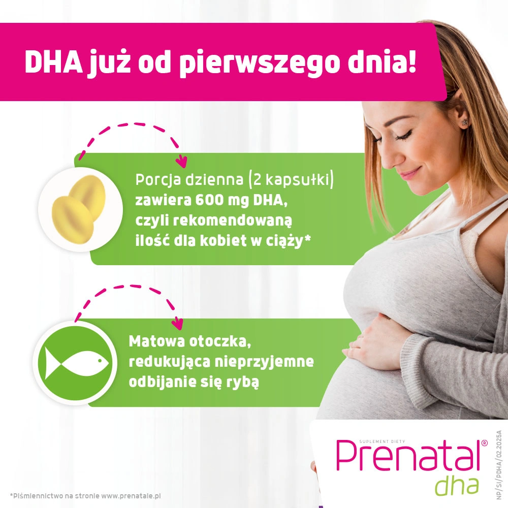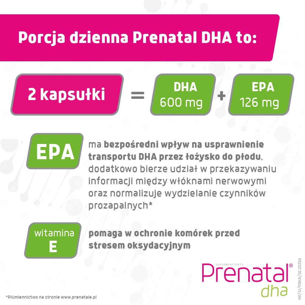 - Prenatal DHA to suplement diety polecany kobietom od początku ciąży do końca karmienia piersią. W dziennej porcji zawiera wysokiej jakości kwasy omega-3, w tym rekomendowaną ilość (600 mg) DHA*.