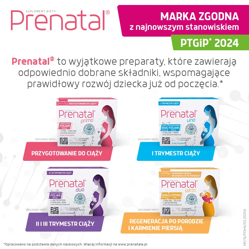 DHA (kwas dokozaheksaenowy) należy do niezbędnych wielonienasyconych kwasów tłuszczowych omega-3. DHA trzeba dostarczać z zewnątrz w gotowej formie, ponieważ organizm syntetyzuje go w ograniczonych ilościach. Stosowanie kwasu DHA w II i III trymestrze ciąży jest szczególnie istotne dla rozwoju mózgu oraz siatkówki oka dziecka*. DHA zapewnia prawidłowy rozwój układu odpornościowego, także w aspekcie właściwej reakcji na alergeny w przyszłości**. W okresie karmienia piersią stosowanie Prenatal DHA może być szczególnie istotne ze względu na dalszy rozwój mózgu dziecka**. PTG rekomenduje stosowanie DHA już od pierwszego dnia ciąży**.
