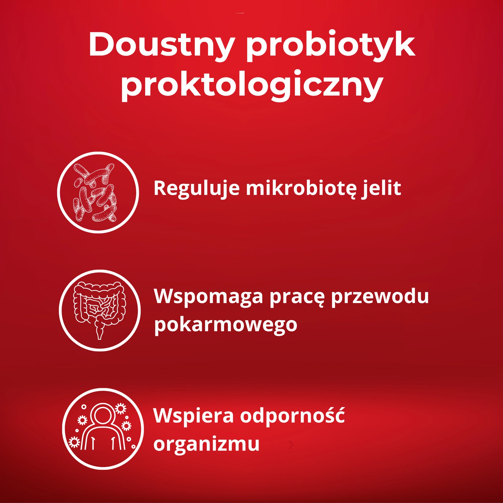 • Specjalistyczny probiotyk proktologiczny wspierający jelita i zdrowie odbytu – pomocny przy hemoroidach, szczelinach odbytu, biegunkach i świądzie odbytu.