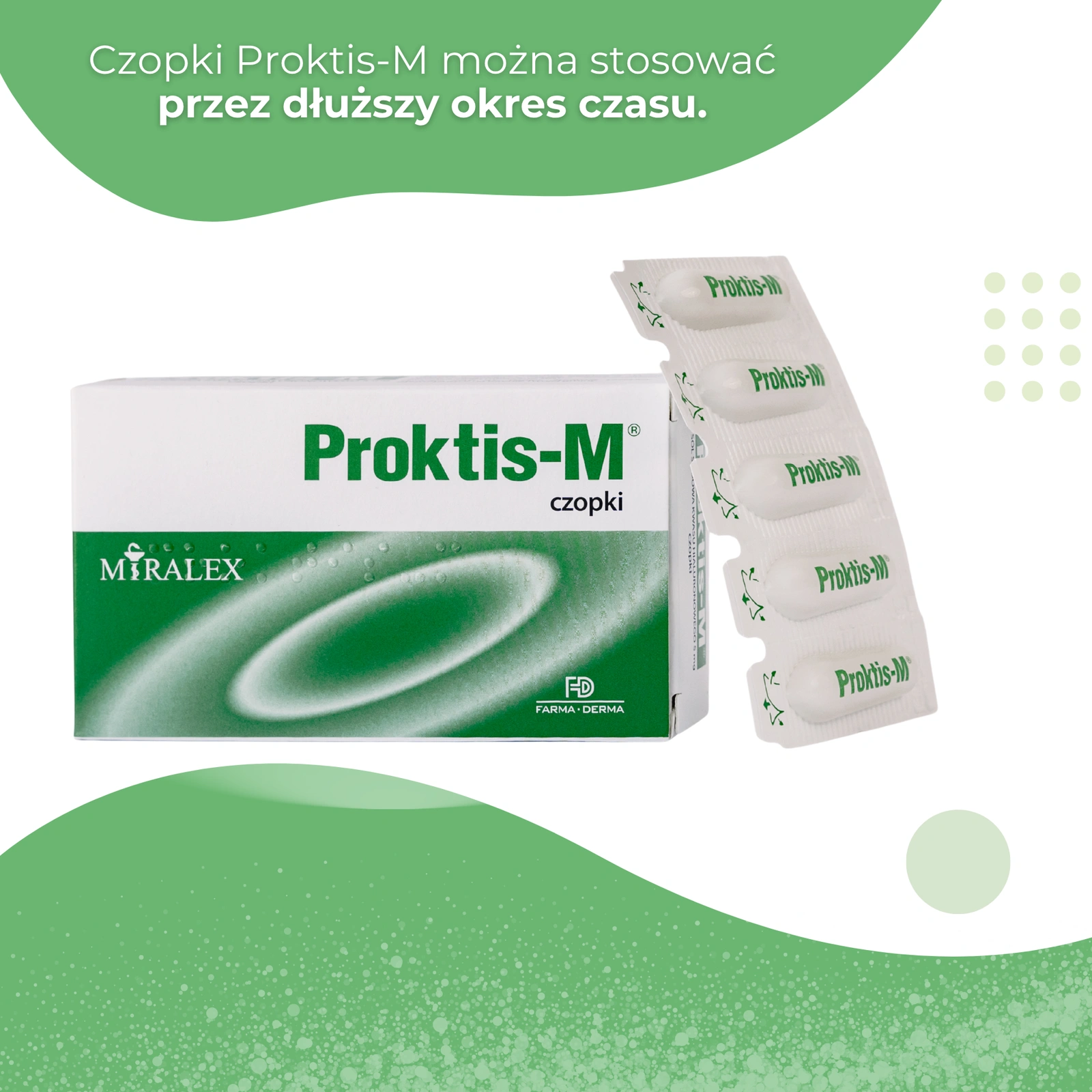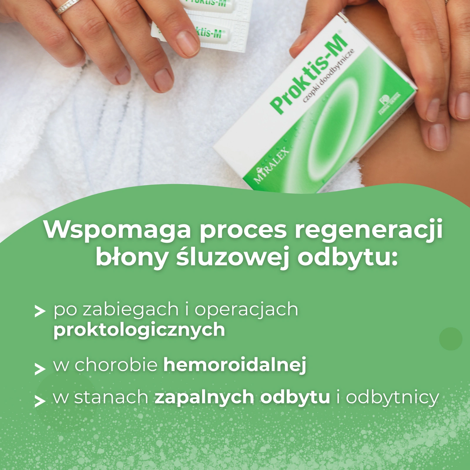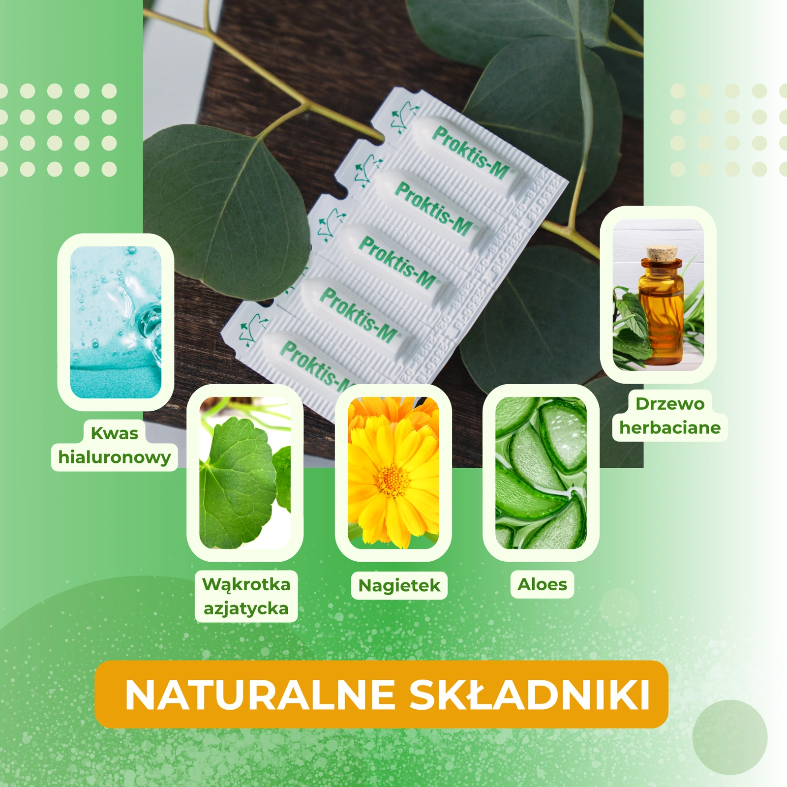 Proktis-M to wyrób medyczny w postaci czopków doodbytniczych, stworzony z myślą o skutecznym wsparciu w leczeniu takich dolegliwości jak hemoroidy, szczelina odbytu, stan zapalny odbytu, ból, pieczenie czy świąd odbytu. Formuła wzbogacona o czopki z kwasem hialuronowym wspomaga naturalne procesy regeneracji i gojenia błony śluzowej odbytu oraz odbytnicy, zapewniając jej nawilżenie i ochronę. Preparat może być stosowany także po zabiegach odbytu, w tym po operacjach proktologicznych, a także w przypadku problemów takich jak krew z odbytu czy przewlekłe choroby odbytu.