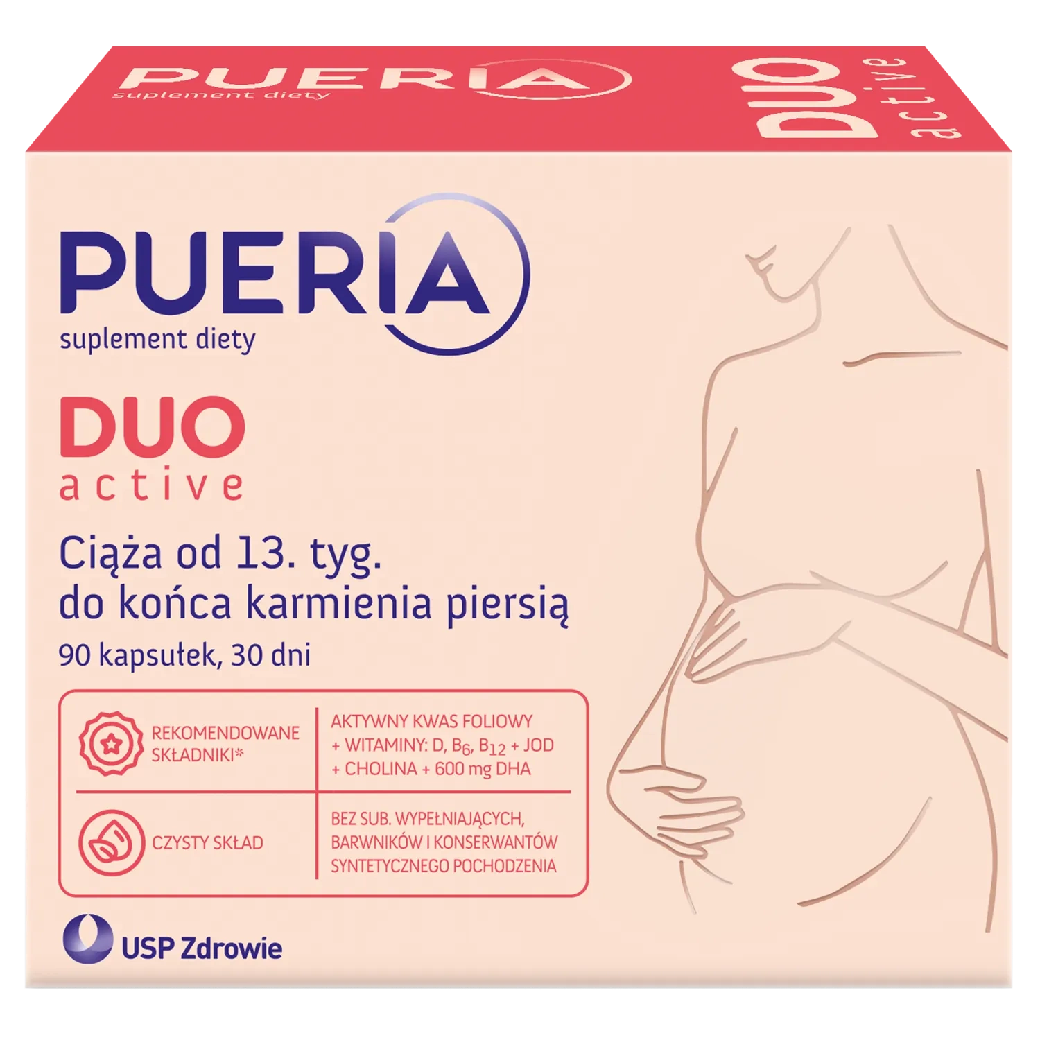 Pueria Duo Active to suplement diety zaprojektowany specjalnie dla kobiet od 13. tygodnia ciąży aż do zakończenia karmienia piersią. Preparat zawiera dwa rodzaje kapsułek: z witaminami i minerałami oraz z kwasami tłuszczowymi omega-3 (DHA i EPA). Formuła produktu odpowiada wytycznym Polskiego Towarzystwa Ginekologów i Położników, które wskazują na konieczność suplementacji m.in. kwasu foliowego, witaminy D, DHA i jodu w tym okresie.