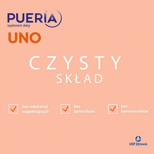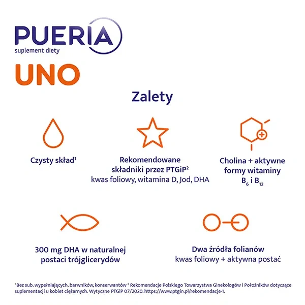 Pueria Uno to suplement diety opracowany z myślą o kobietach planujących ciążę oraz w ciąży do 12. tygodnia. Formuła łączy dwa źródła folianów (kwas foliowy i L-metylofolian wapnia), witaminę D, jod, cholinę oraz kapsułkę z DHA (z niewielką ilością EPA), a także aktywne formy witamin B6 (P-5-P) i B12 (metylokobalamina). Preparat jest zgodny z aktualnymi zaleceniami dotyczącymi suplementacji w okresie przedkoncepcyjnym i na początku ciąży. Zestaw dwóch kapsułek dziennie (1 kaps. witaminowo-mineralna + 1 kaps. DHA) ułatwia dopasowanie podaży kluczowych składników do potrzeb organizmu już od etapu planowania.