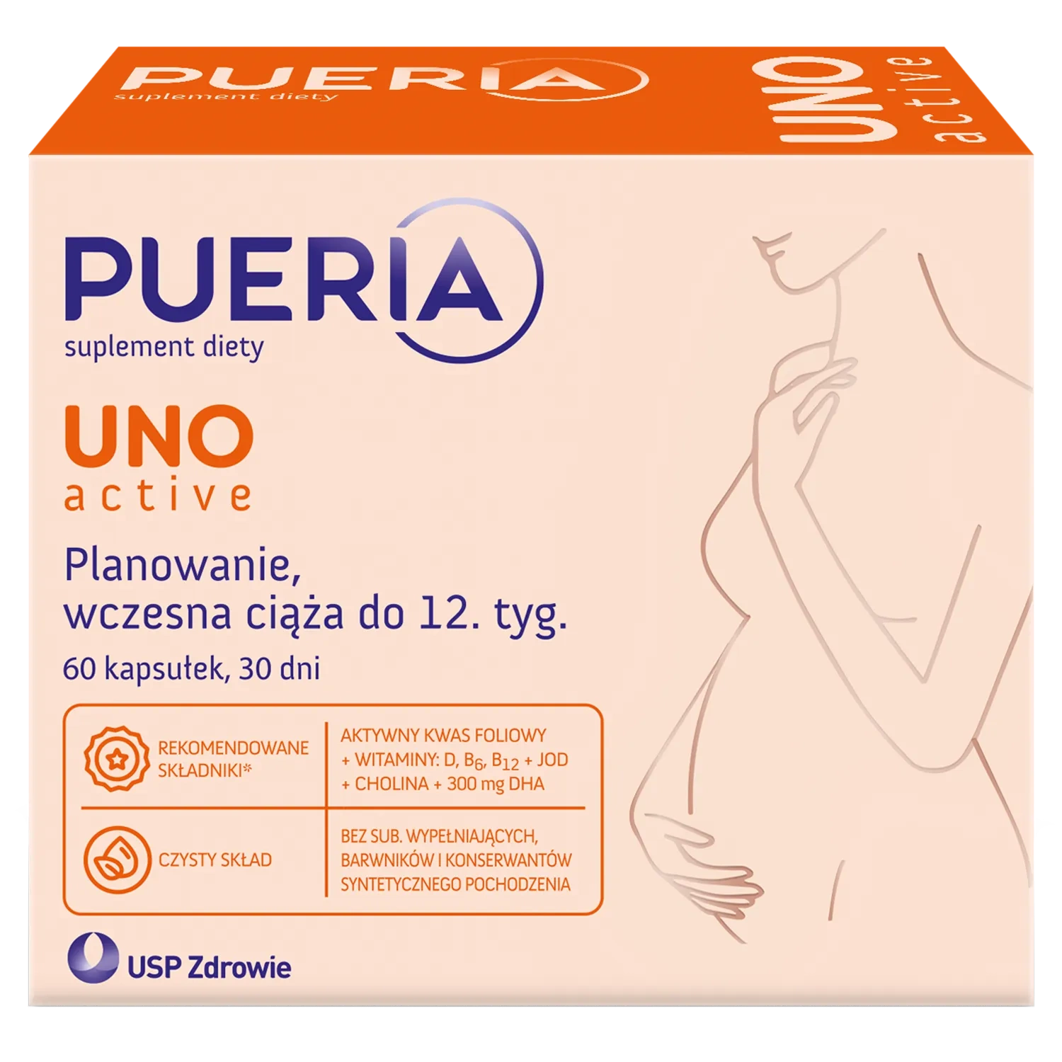 Pueria Uno Active to kompleksowy suplement diety opracowany z myślą o potrzebach kobiet planujących ciążę oraz w ciąży do 12. tygodnia. Preparat występuje w formie dwóch kapsułek dziennie – jednej z witaminami i minerałami oraz jednej z kwasami tłuszczowymi omega-3 (DHA i EPA). Dzięki temu zapewnia odpowiednią porcję składników rekomendowanych przez Polskie Towarzystwo Ginekologów i Położników, wspierając organizm przyszłej mamy i prawidłowy rozwój płodu.