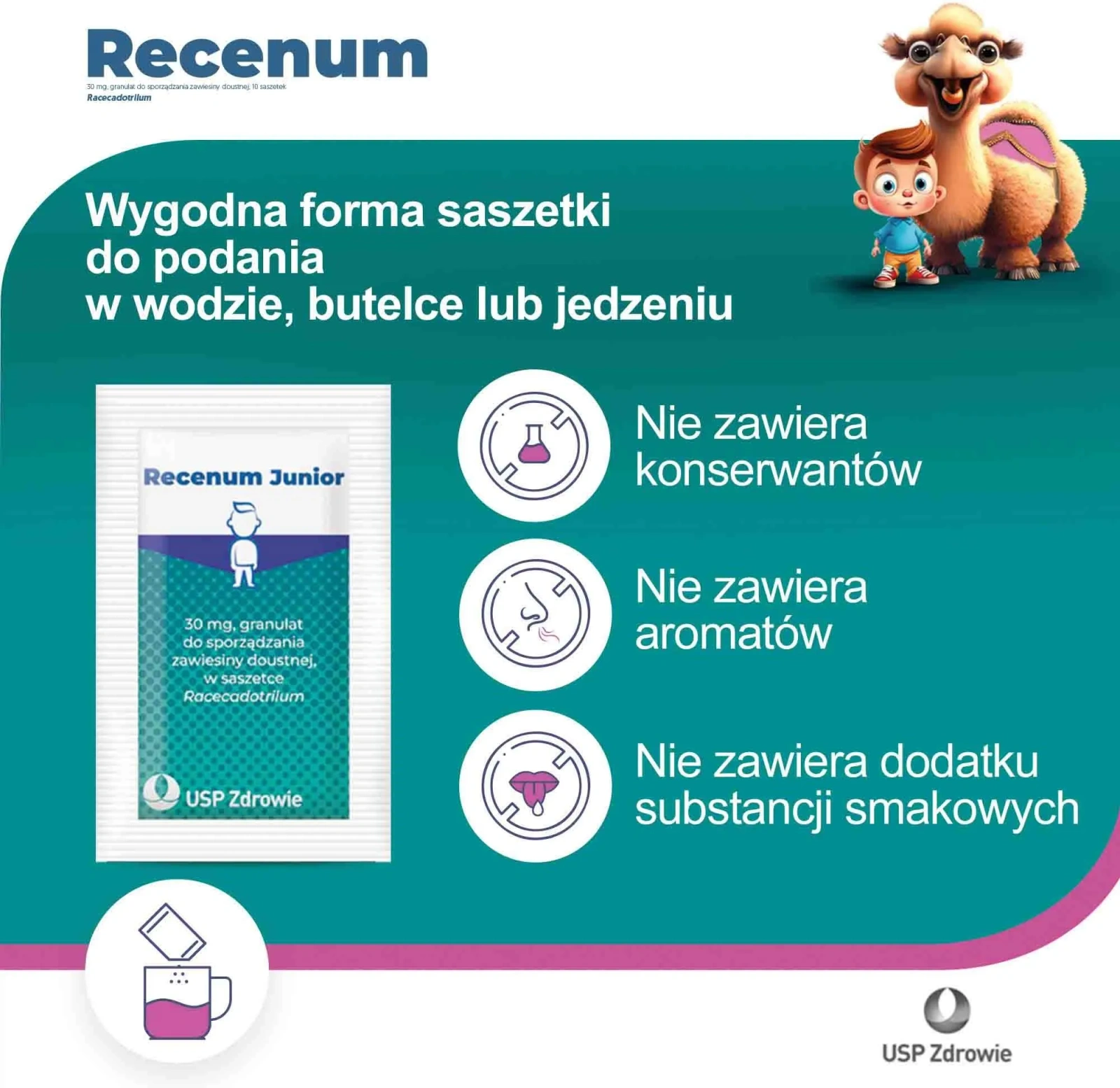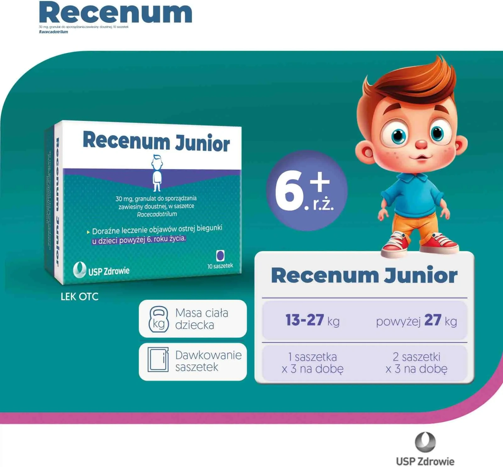 - Recenum Junior 30 mg to produkt leczniczy stosowany w doraźnym leczeniu objawów ostrej biegunki u dzieci powyżej 6 roku życia.
