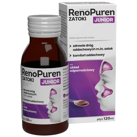 Syrop Renopuren Zatoki junior płyn podnosi komfort oddychania i stymuluje układ immunologiczny.