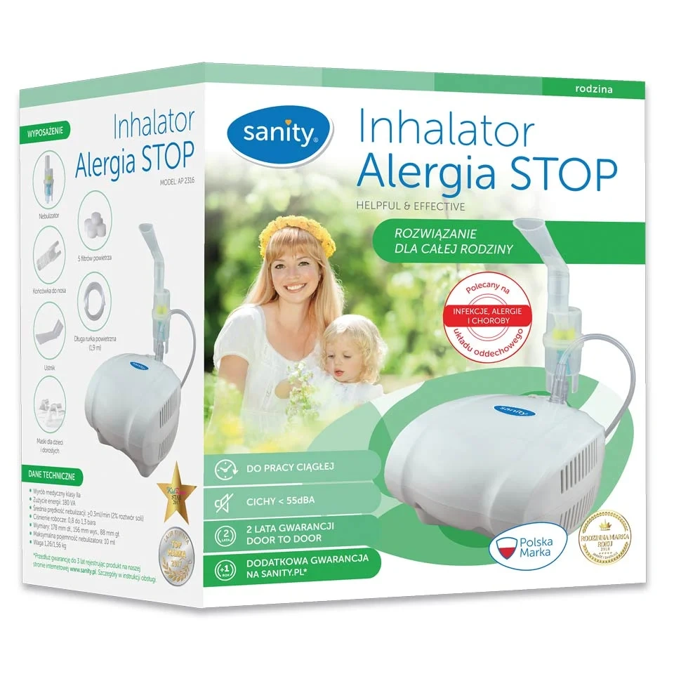 - Kompaktowe urządzenie medyczne dla całej rodziny, skutecznie łagodzące objawy alergii i wspomagające leczenie schorzeń dróg oddechowych.