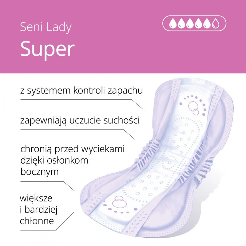 Seni Lady Super to wkładki urologiczne stworzone specjalnie dla aktywnych, samodzielnych kobiet, które oczekują dyskrecji, komfortu i skutecznej ochrony przy średnim nietrzymaniu moczu. Dzięki wysokiej chłonności, anatomicznemu kształtowi oraz innowacyjnym rozwiązaniom poprawiającym suchość i higienę, wkładki zapewniają pewność siebie przez cały dzień. Pozwalają zachować naturalne poczucie świeżości i pozostają niewidoczne pod ubraniem, jednocześnie chroniąc skórę przed podrażnieniami.