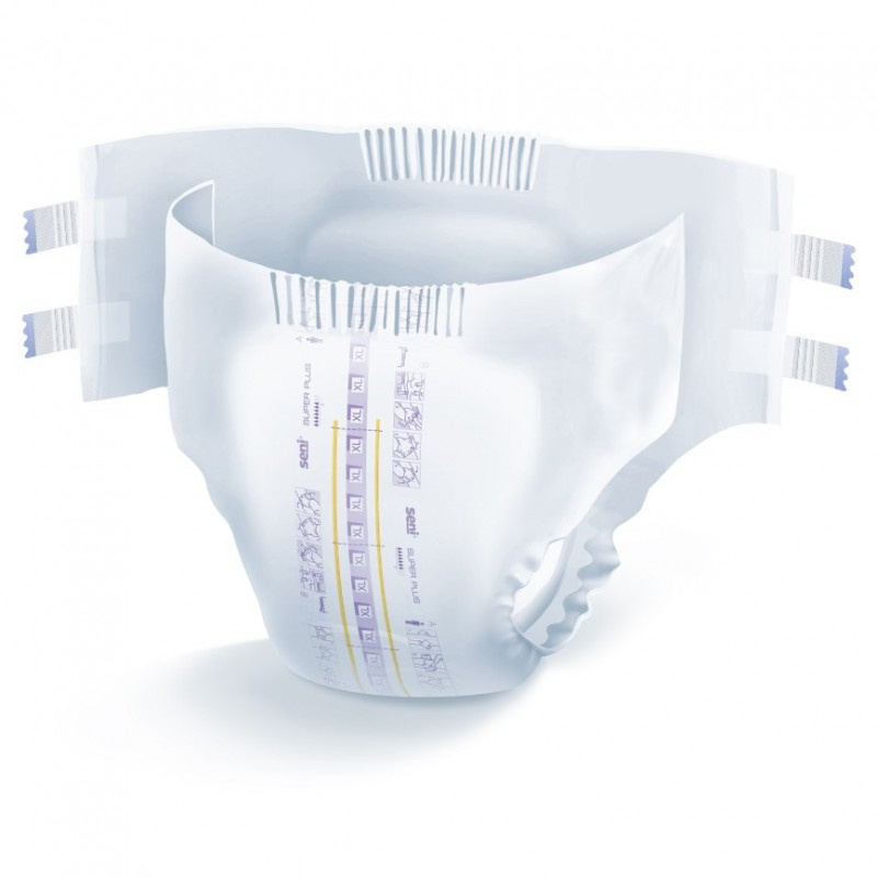 - Oddychające pieluchomajtki Seni Super Plus XL zapinane na rzepy – dla dorosłych z nietrzymaniem moczu i kału, wysoka chłonność.