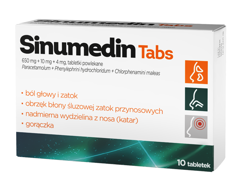 Sinumedin Tabs to połączenie trzech substancji o komplementarnym działaniu: paracetamolu 650 mg (przeciwbólowo i przeciwgorączkowo), fenylefryny 10 mg (obkurcza błonę śluzową nosa i ujścia zatok) oraz chlorofenaminy 4 mg (przeciwhistaminowo – zmniejsza wodnistą wydzielinę z nosa). Lek przeznaczony jest do objawowego leczenia ostrego zapalenia zatok przynosowych (ból głowy, zatkany nos, katar) oraz do łagodzenia objawów przeziębienia i grypy u dorosłych i młodzieży od 12 lat. Dzięki wygodnej formie powlekanych tabletek wspiera szybki powrót do codziennej aktywności.