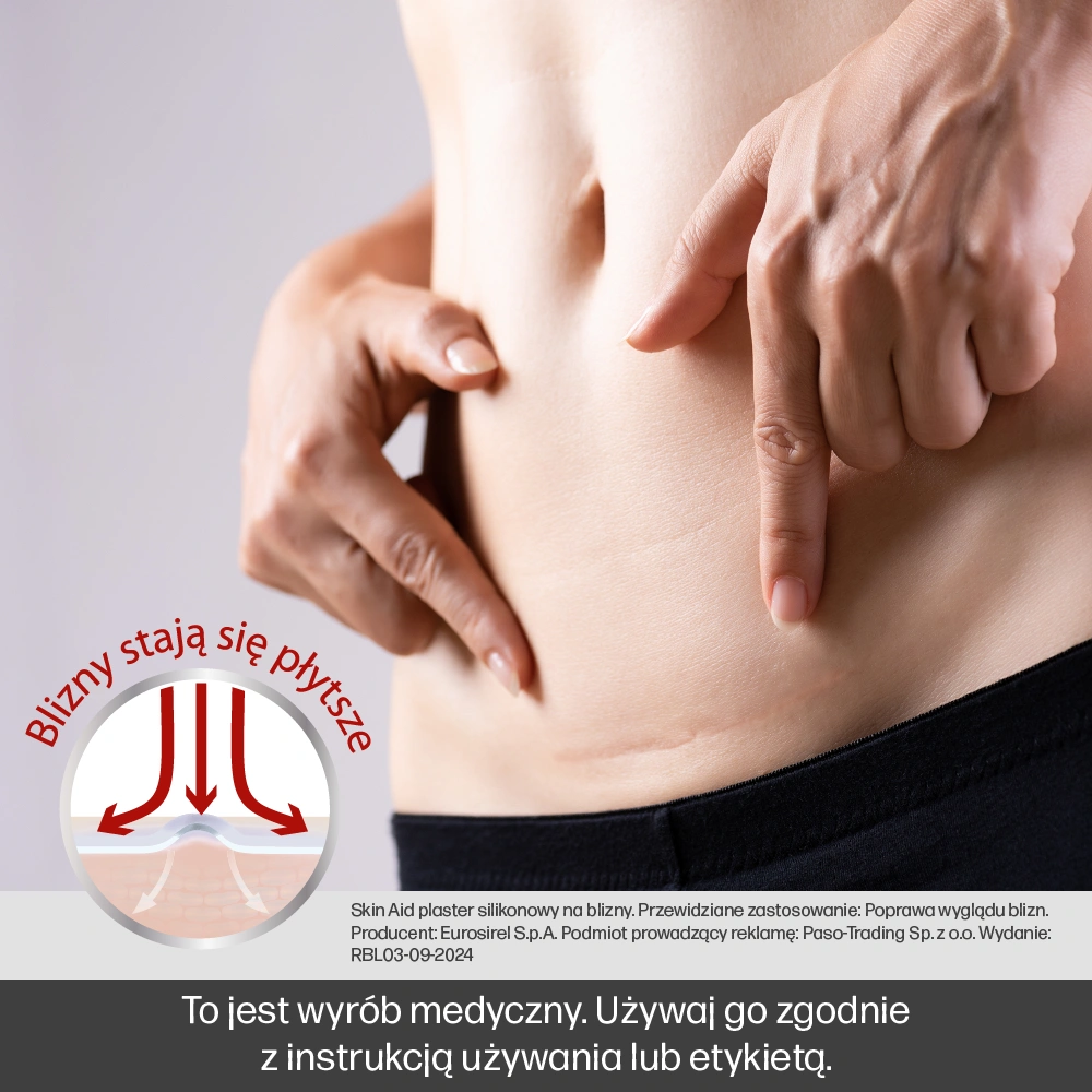 - Elastyczny plaster silikonowy do pielęgnacji blizn różnego pochodzenia, wspierający wygładzanie i rozjaśnianie skóry.