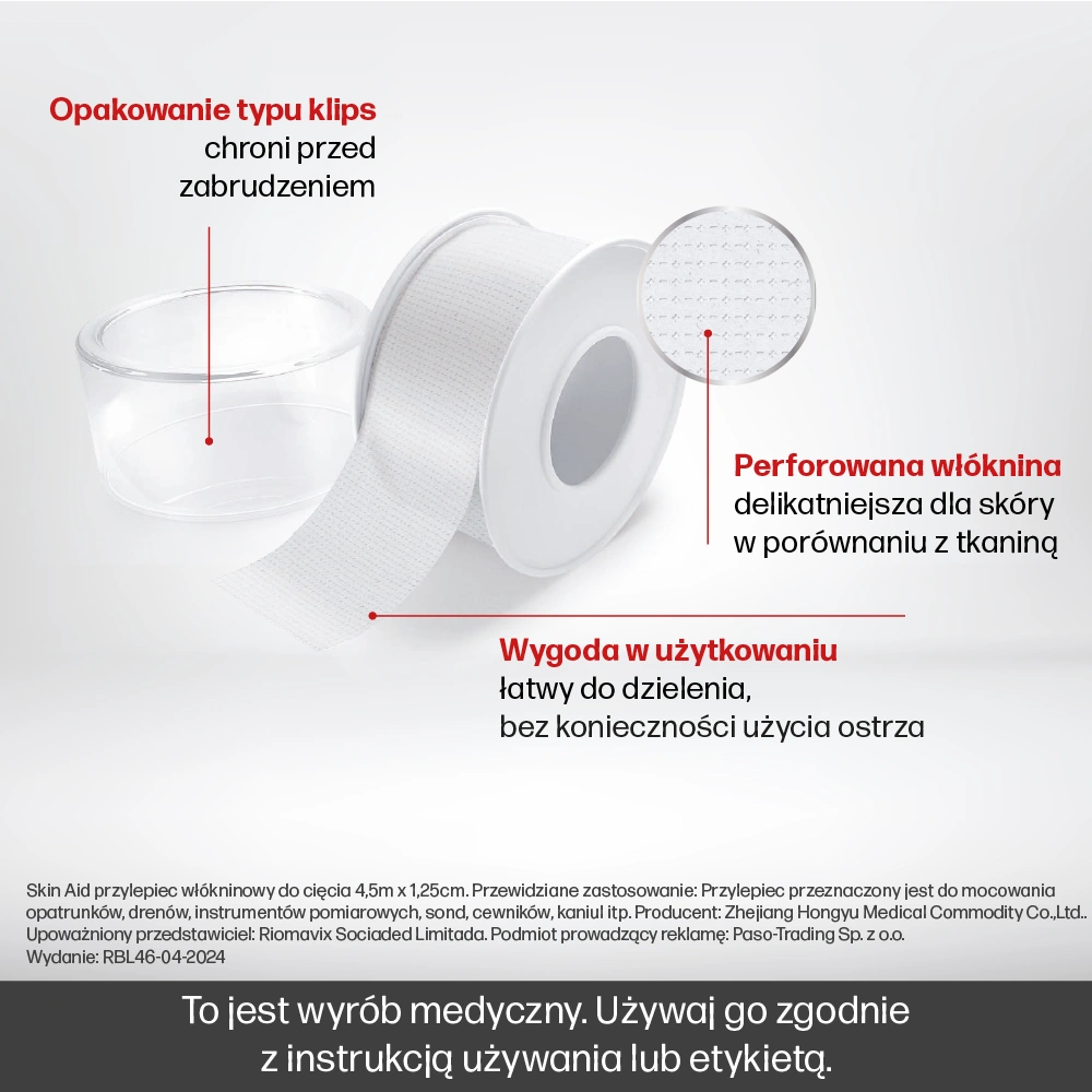 Skin Aid przylepiec włókninowy o wymiarach 4,5 m x 1,25 cm to niezastąpiony element każdej domowej i profesjonalnej apteczki. Przeznaczony do mocowania opatrunków, drenów, sond i innych akcesoriów medycznych, łączy delikatność dla skóry z wysoką skutecznością mocowania. Wygodna forma rolki z klipsem zapewnia higieniczne przechowywanie i łatwą aplikację – także bez potrzeby użycia nożyczek.