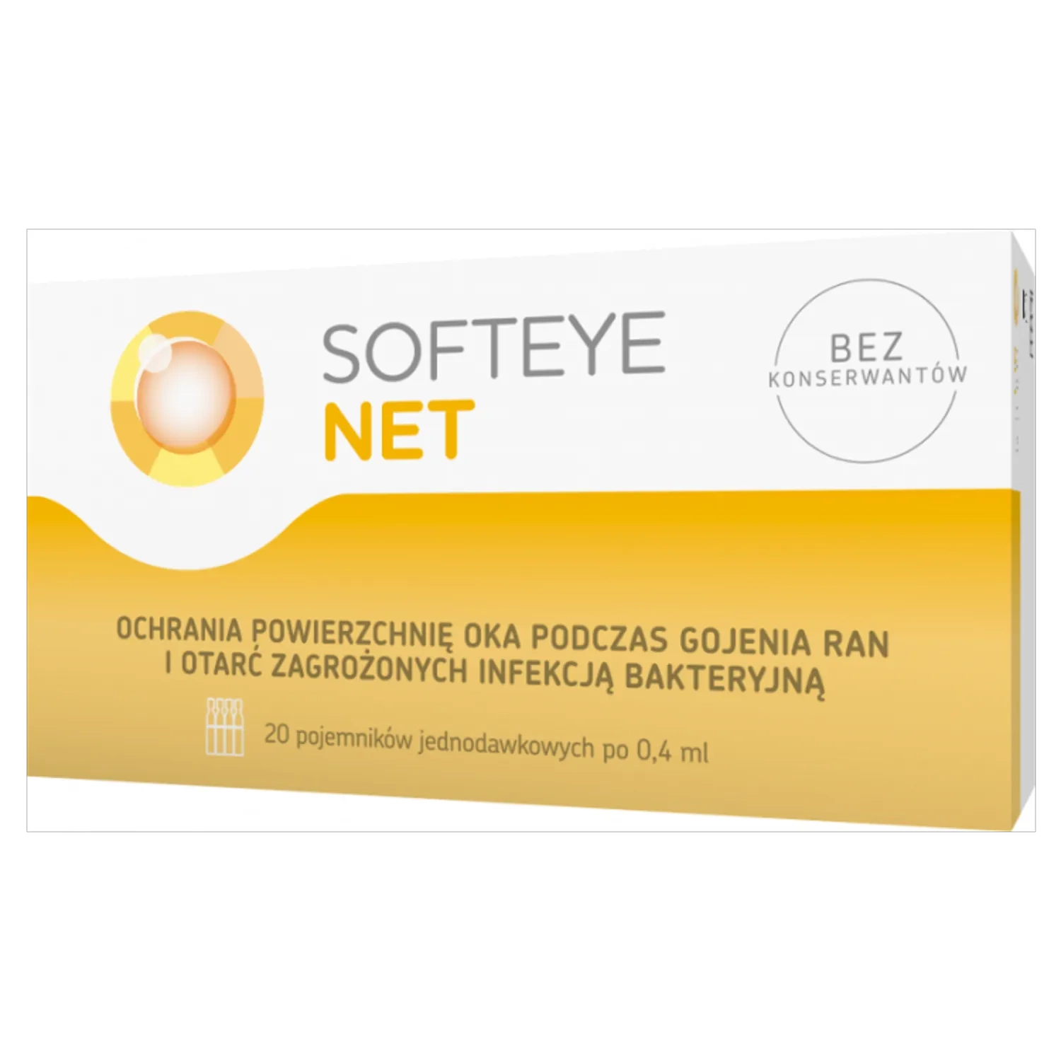 Produkt SOFTEYE Net jest wskazany w leczeniu ran i otarć na powierzchni gałki ocznej, będących skutkiem urazu lub zabiegu chirurgicznego na oku. Stosowanie produktu SOFTEYE Net jest zalecane osobom, które w ocenie lekarza są zagrożone wystąpieniem infekcji bakteryjnej. SOFTEYE Net zawiera dwa naturalne polimery: hialuronian sodu i gumę ksantanową. Po zaaplikowaniu produktu do worka spojówkowego łączy się on z filmem łzowym i tworzy przezroczystą, lepką powłokę, która dzięki zmniejszeniu tarcia wywołanego ruchami gałki ocznej i mruganiem ochrania powierzchnię oka i przyspiesza proces gojenia ran i otarć. SOFTEYE Net zawiera także netylmycynę 0,3% - antybiotyk aminoglikozydowy o szerokim spektrum działania, którego zadaniem jest obniżenie ryzyka wystąpienia infekcji bakteryjnej.