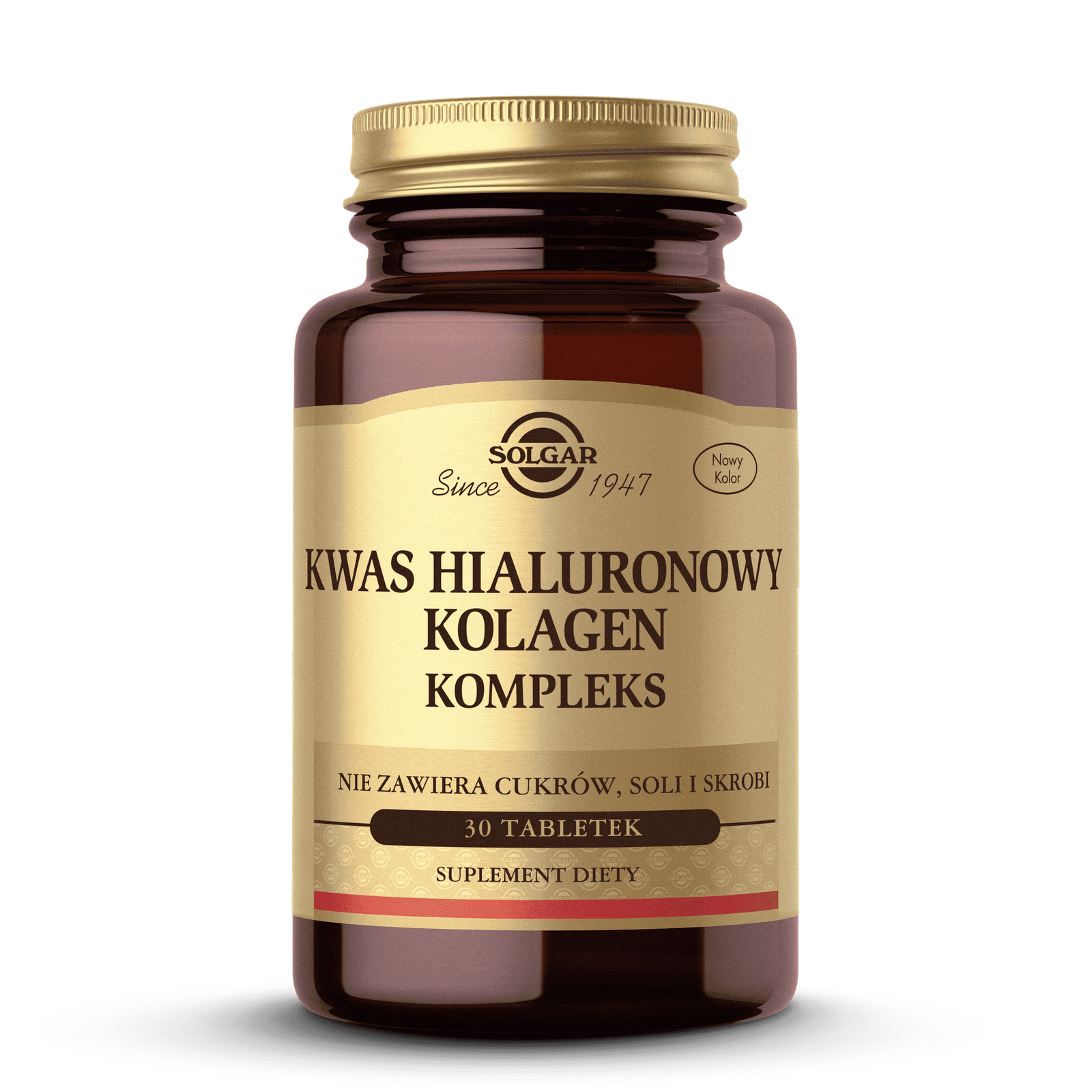 - SOLGAR Kwas hialuronowy Kolagen Kompleks to suplement diety z kwasem hialuronowym, chondroityną i kolagenem typu II, wspierający stawy i skórę.