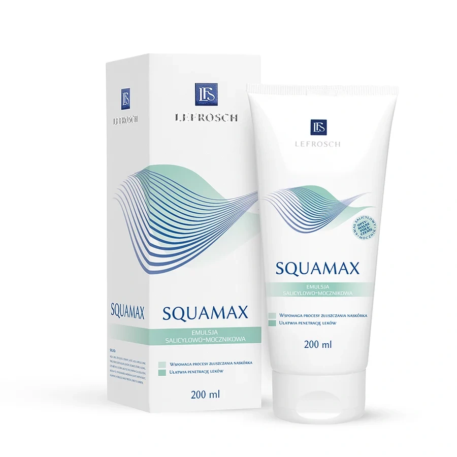 Squamax Emulsja to innowacyjny preparat dermatologiczny, który jako pierwszy połączył kwas mlekowy, kwas salicylowy i mocznik w jednej formule. Dzięki temu działa złuszczająco, nawilżająco i zmiękczająco, skutecznie redukując nadmierne rogowacenie skóry. Emulsja ułatwia przenikanie składników aktywnych oraz zwiększa skuteczność innych preparatów stosowanych miejscowo. Regularne stosowanie pomaga przywrócić skórze gładkość, elastyczność i zdrowy wygląd.