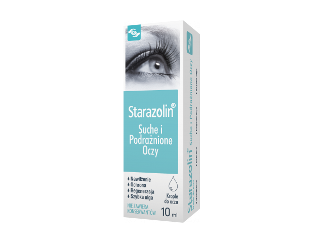 Krople do oczu Starazolin Suche i Podrażnione Oczy są przeznaczone do stosowania w celu zmniejszenia nasilenia objawów w łagodnej do umiarkowanej postaci zespołu suchego oka i/lub podrażnieniu powierzchni oka. Starazolin Suche i Podrażnione Oczy stabilizuje film łzowy, nawilża oko i odbudowuje jego powierzchnię.