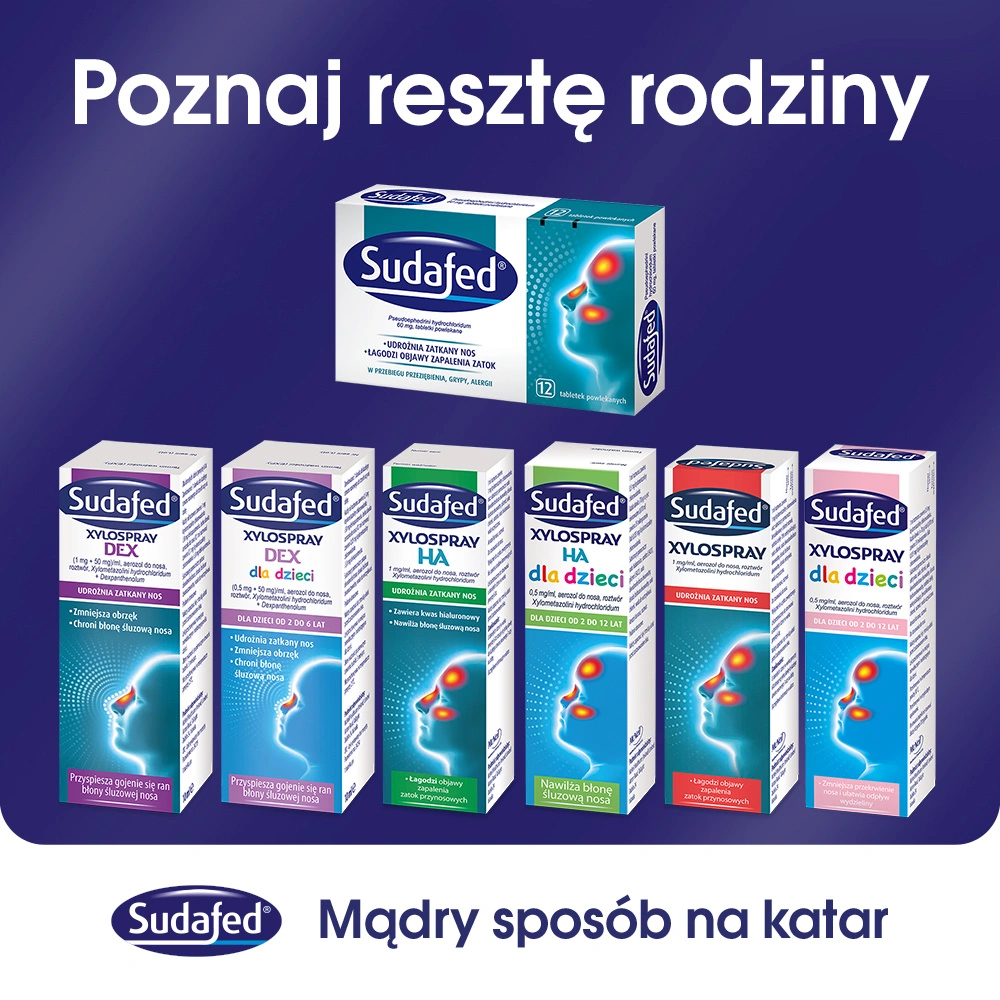 - SUDAFED XYLOSPRAY to aerozol do krótkotrwałego leczenia przekrwienia błony śluzowej nosa i kataru podczas przeziębienia oraz stanów zapalnych górnych dróg oddechowych.