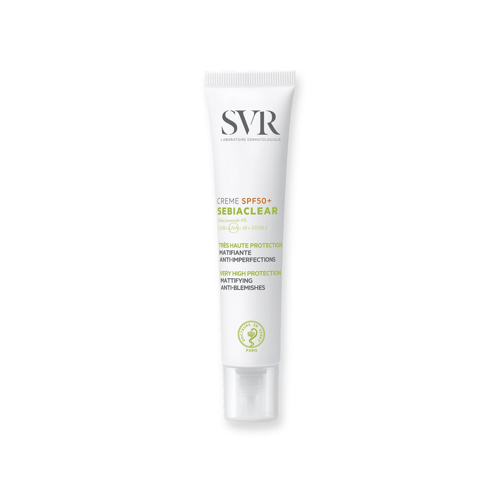Sebiaclear Crème SPF50+ to nowa hybrydowa formuła, która w jednym produkcie łączy w sobie  ochronę przeciwsłoneczną i dermatologiczny krem pielęgnujący skórę trądzikową. Redukuje niedoskonałości i zaskórniki, matuje cerę, zapobiega brązowym i czerwonym śladom oraz efektowi z odbicia (będącym efektem ekspozycji na słońce).