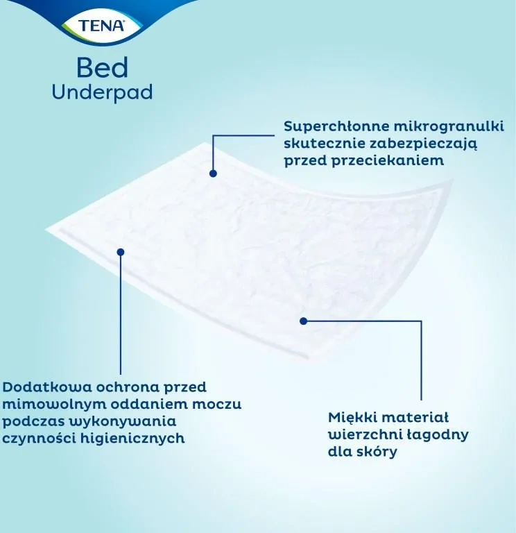 TENA Bed Normal jest przeznaczony do ochrony powierzchni takich jak materace, krzesła, sofy czy wózki inwalidzkie przed przypadkowym popuszczaniem moczu. Idealny podczas procedur higienicznych, zapewnia dodatkową ochronę i komfort użytkownika.