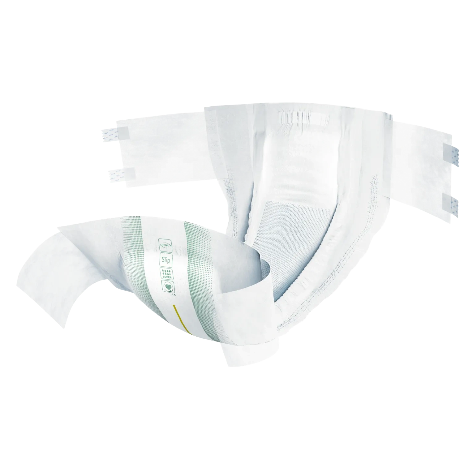 TENA Slip Super to uniwersalny produkt na nietrzymanie moczu o otwartej konstrukcji z regulowanymi rzepami umożliwiającymi idealne dopasowanie, dzięki czemu zapewnia komfort i ochronę przed przeciekaniem. TENA Slip ProSkin wykonane są z materiału podobnego do tkaniny, zapewniają ścisłe dopasowanie i znakomite zabezpieczenie przed przeciekaniem dzięki superchłonnemu wkładowi. To idealne rozwiązanie dla osób unieruchomionych lub z ograniczeniami ruchowymi. Dzięki technologii FeelDry Advanced™ produkt szybko wchłania płyn, pozostawiając suchą skórę. Szybkochłonny wkład błyskawicznie wiąże wewnątrz nawet duże ilości moczu, dając uczucie suchości, a w pełni oddychający panel tylny ConfioAir™ pozwala skórze oddychać. Wszystkie te cechy pomagają zachować naturalne zdrowie skóry. Otwarta konstrukcja z mocnymi rzepami umożliwia łatwą zmianę produktu w pozycji leżącej lub stojącej. Rzepy można wielokrotnie zapinać i odpinać, aby uzyskać idealne dopasowanie. Produkt zapewnia większą świeżość dzięki neutralizatorowi zapachu oraz wskaźnikowi wilgoci, który pokazuje, kiedy należy zmienić produkt.