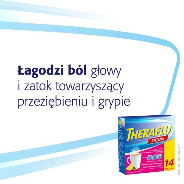 - Theraflu Zatoki jest lekiem stosowanym w łagodzeniu objawów związanych z dolegliwościami zatok. Zawiera dwie substancje czynne – paracetamol i chlorowodorek fenylefryny – które wspomagają się w działaniu.