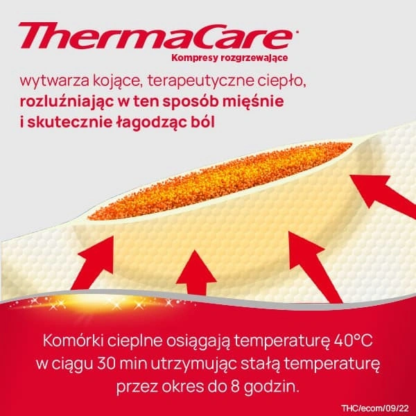 Kompresy rozgrzewające ThermaCare łagodzą ból do 16 godzin – 8 godzin podczas noszenia i do 8 godzin ulgi po zdjęciu kompresu. Działają bezpośrednio w miejscu bólu. Opatentowana technologia komórek cieplnych powoduje głębokie i równomierne na całej powierzchni wnikanie ciepła. Komórki cieplne osiągają temperaturę ok. 40°C w ciągu 30 minut utrzymując stałą temperaturę przez okres do 8 godzin. Kompresy wytwarzają kojące, terapeutyczne ciepło, rozluźniając w ten sposób mięśnie i łagodząc ból. Pomagają poprawić ruchomość.