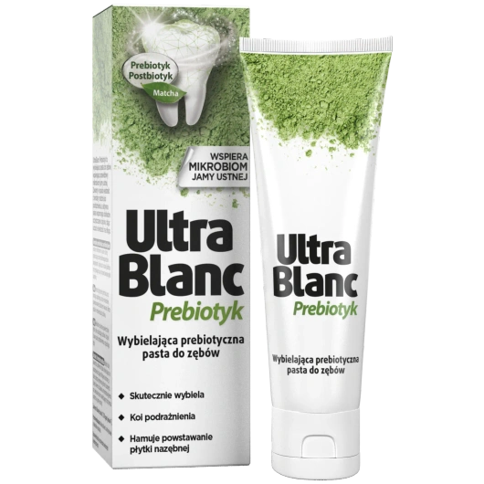 UltraBlanc Prebiotyk wybielająca pasta do zębów 75 ml to nowoczesna pasta łącząca skuteczne, a jednocześnie delikatne wybielanie z troską o zdrowy mikrobiom jamy ustnej. Innowacyjna formuła z kompleksem prebiotyku i postbiotyku pomaga utrzymać równowagę mikroflory, ograniczając rozwój patogenów odpowiedzialnych za próchnicę i choroby dziąseł. Aktywna piana dokładnie oczyszcza powierzchnię zębów, a perlit usuwa osad i przebarwienia, polerując szkliwo bez ryzyka jego uszkodzenia. Ekstrakt z herbaty matcha koi podrażnienia dziąseł, wspierając regenerację błon śluzowych i zapewniając długotrwałe uczucie świeżości.