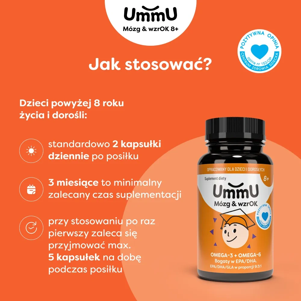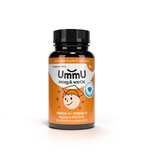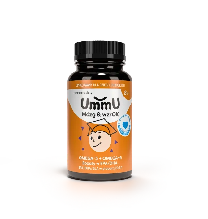 UmmU Mózg & Wzrok 8+ to suplement diety stworzony z myślą o dzieciach powyżej 8. roku życia oraz dorosłych, którzy chcą uzupełnić swoją dietę w kwasy tłuszczowe omega-3, omega-6 oraz witaminę E. Produkt zawiera starannie dobraną kompozycję EPA, DHA, GLA oraz witaminy E – składników, które wspierają prawidłowe funkcjonowanie mózgu i wzroku¹ oraz serca². Suplement jest szczególnie polecany w okresie intensywnej nauki, rozwoju oraz w sytuacjach, gdy dieta uboga jest w tłuste ryby i naturalne źródła kwasów omega-3. Dzięki łagodnemu smakowi, wysokiej czystości oleju rybiego oraz technologii Golden Omega® suplement jest wygodny i przyjemny w codziennym stosowaniu.