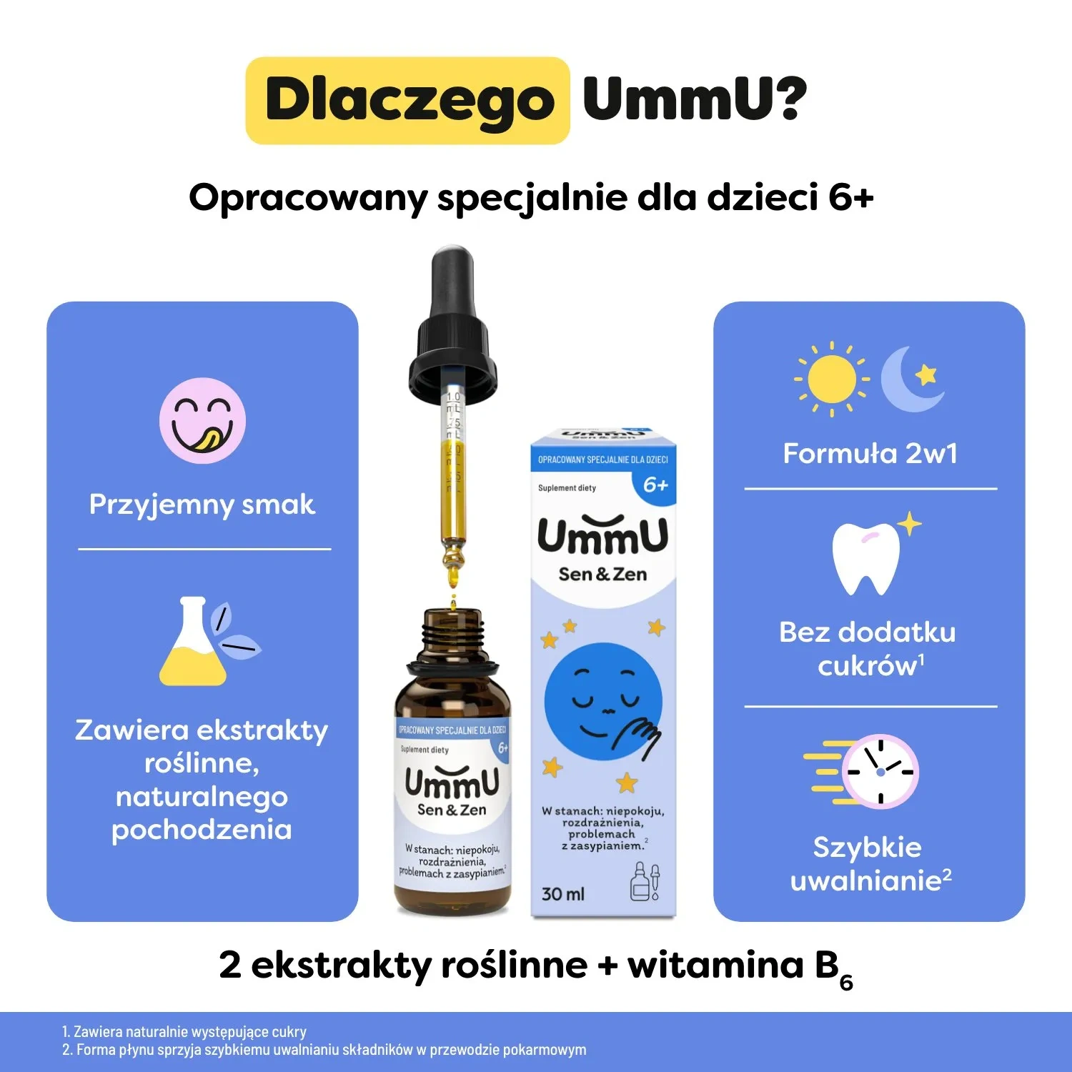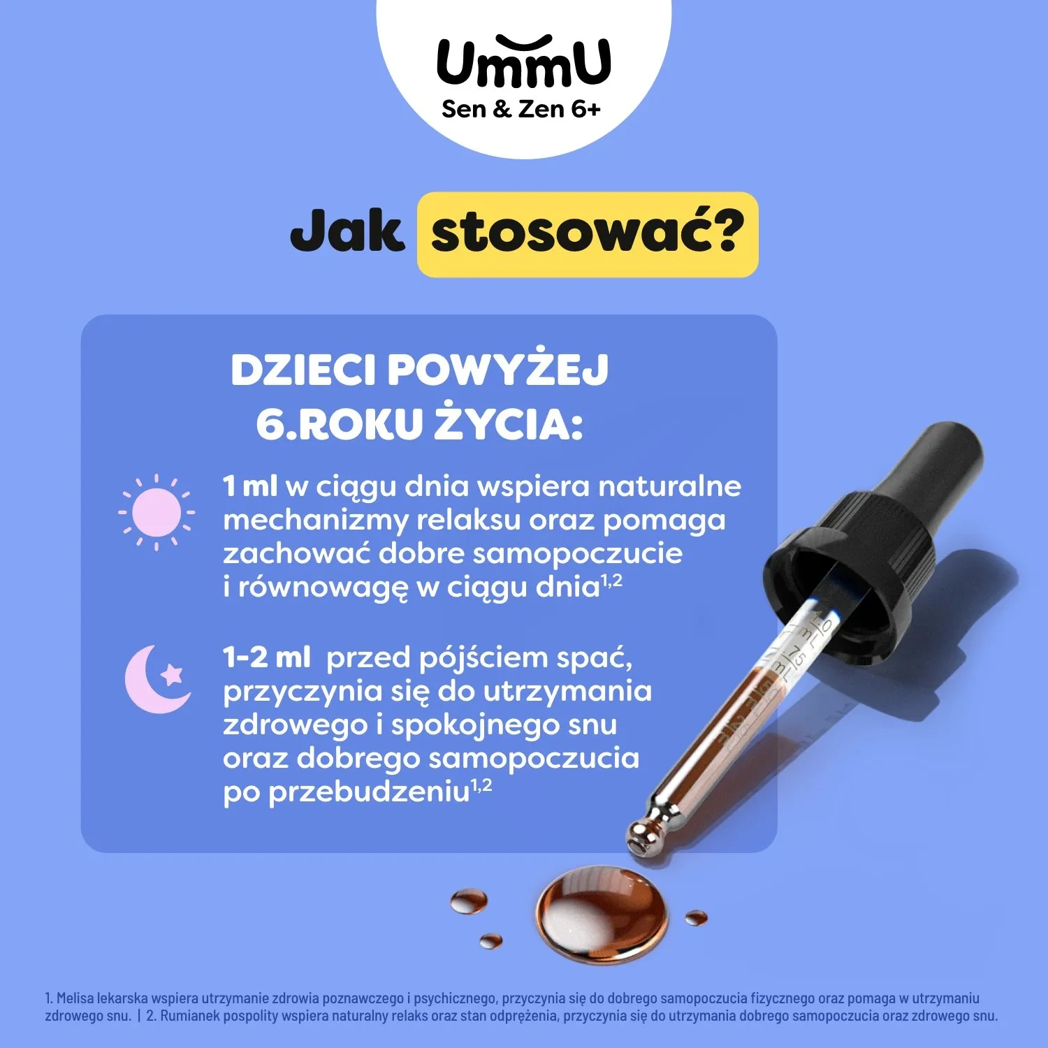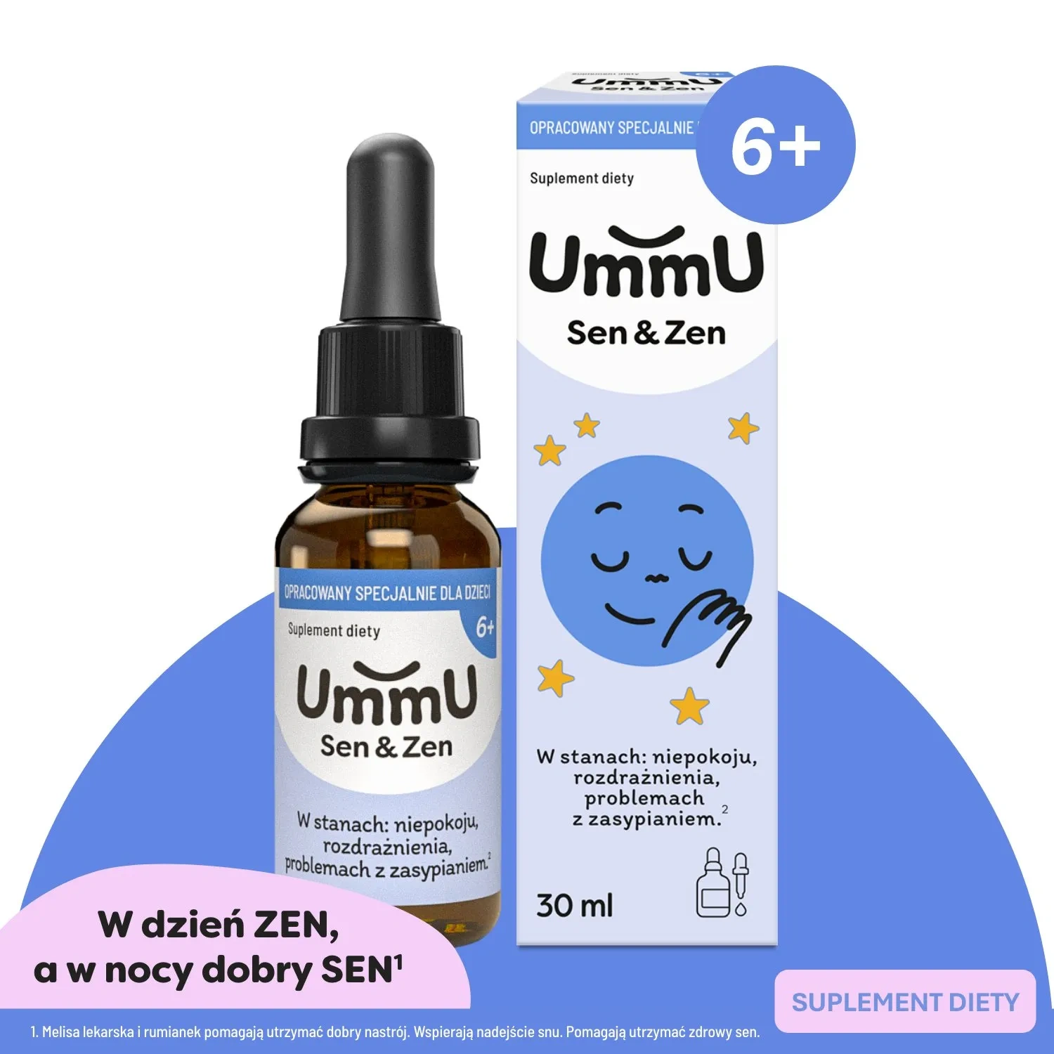 UmmU Sen&Zen 6+ to suplement diety w płynnej postaci, opracowany specjalnie dla dzieci powyżej 6. roku życia. Zawiera naturalne ekstrakty roślinne – melisę i rumianek – które wspierają odprężenie, dobre samopoczucie i zdrowy sen. Formuła została uzupełniona o witaminę B6, która pomaga w prawidłowym funkcjonowaniu układu nerwowego. Preparat ma przyjemny smak i wygodną formę kropli, a dołączona pipeta z podziałką umożliwia precyzyjne odmierzanie porcji. Dzięki temu suplement można łatwo podawać bezpośrednio do ust, na łyżeczce lub po rozcieńczeniu w niewielkiej ilości płynu.
